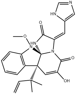 英文同義詞:6-O-Methyloxaline, Meleagrine;MELEAGRIN;[3E,7aR,12aS,(-)]-7a-(1,1-Dimethyl-2-propenyl)-7a,12-dihydro-6-hydroxy-3-(1H-imidazole-4-ylmethylene)-12-methoxy-1H,5H-imidazo[1',2':1,2]pyrido[2,3-b]indole-2(3H),5-dione;Meleagrine;1H,5H-Imidazo[1',2':1,2]pyrido[2,3-b]indole-2,5(3H)-dione, 7a-(1,1-dimethyl-2-propen-1-yl)-7a,12-dihydro-6-hydroxy-3-(1H-imidazol-5-ylmethylene)-12-methoxy-, (3E,7aR,12aS)-;(7AR,12aS,E)-3-((1H-imidazol-5-yl)methylene)-6-hydroxy-12-methoxy-7a-(2-methylbut-3-en-2-yl)-7a,12-dihydroimidazo[1',2':1,2]pyrido[2,3-b]indole-2,5(1H,3H)-dione